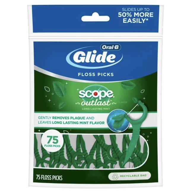 Some floss picks to try include Plackers Micro Line Dental Floss Picks or Oral-B Complete Glide Floss Picks.